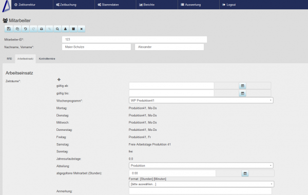 - Der Zugriff von Mitarbeitern auf das Back-end, um den Monatsbericht einzusehen und (sofern unternehmensseitig gewünscht) Stammdaten und/oder Fehltage einzutragen bzw. zu korrigieren ist denkbar. Überstundenfreigabe durch Vorgesetzte direkt über das Back-end wäre möglich. Mitarbeiterseitige Änderungen können direkt oder nach der Freigabe der Änderungen durch die Buchhaltung aktiv werden.