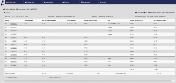 - einer webbasierten Benutzeroberfläche (das "Back-end"). Dort können die MitarbeiterInnen der Buchhaltung die Mitarbeiter-Stammdaten einpflegen, Arbeitszeitkorrekturen durchführen sowie Fehl- und Krankheitstage eintragen. Zudem kann der Mitarbeiter-Monatsbericht für jeden Mitarbeiter eingesehen werden. Aus dem Mitarbeiter-Monatsbericht können direkt Fehltage nachgetragen werden, Überstunden genehmigt werden und Arbeitszeiten korrigiert werden.